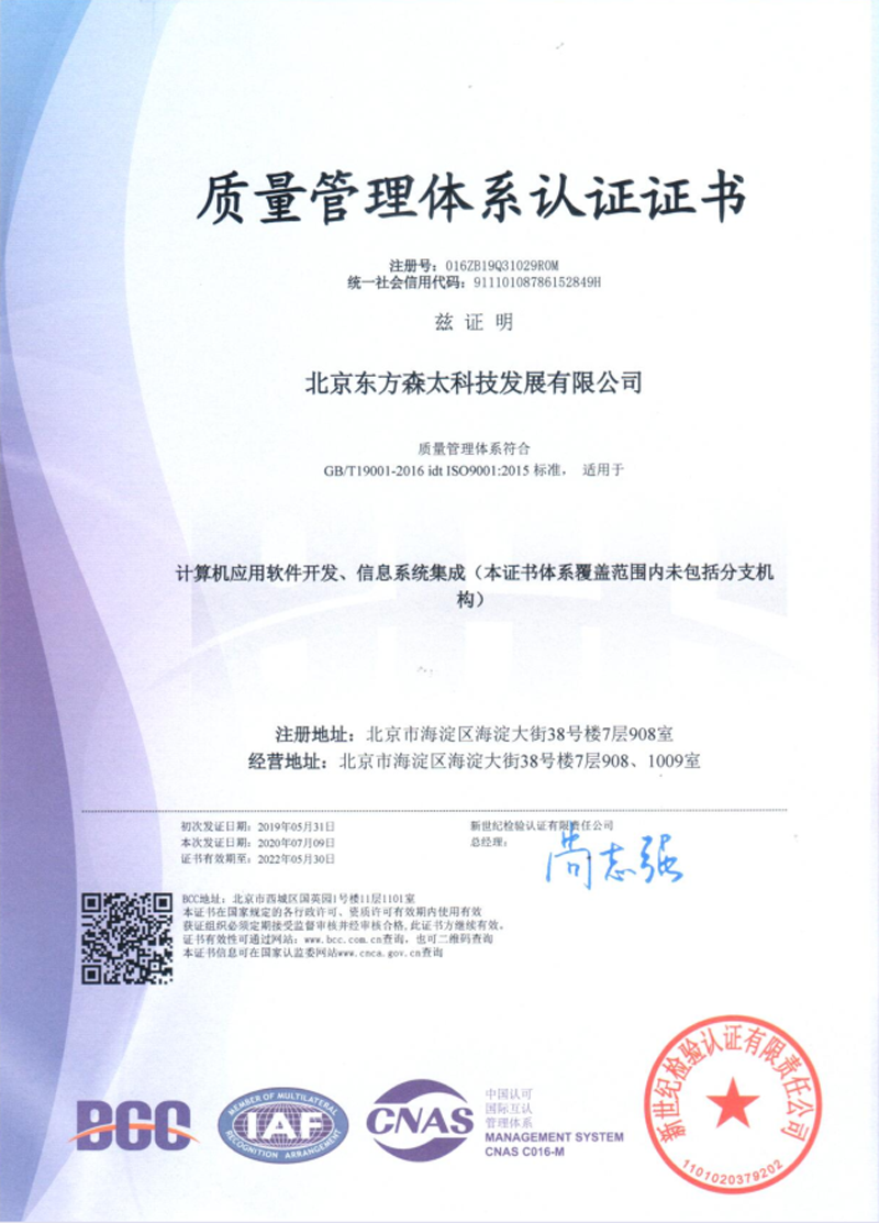 作为ICT解决方案提供商,北京东方森太科技发展有限公司(以下简称东方森太)深知服务品质的重要性。早在2014年,东方森太便抢先一步,成功取得ISO9001体系认证证书,走上规范化、标准化、科学化的现代企业管理道路。