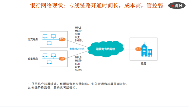 由于需要更稳定可靠的交易过程,金融业的广域网一直以来都采用专线网的模式,虽然价格居高不下,但还算成熟,稳定。随着业务数据类型的不断发展变化,特别是疫情以来更是催生和推动了VOIP、电子视频面签、视频会议以及移动端APP增值类数据的持续高速增加。让使用总分部署、价格昂贵但周期过长、维护程序繁琐的专线网越来越不能满足要求。