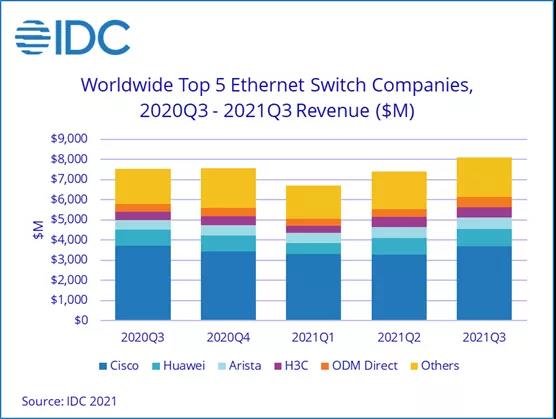 Arista Networks 的以太网交换机收入在 2021 年第三季度增长了 23.0%,占整个市场份额的 7.3%。