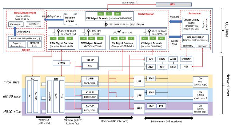 网络层为各个切片提供所需的用户和控制平面功能;OSS 层托管了用于网络切片的设计、配置和操作的所有资产。