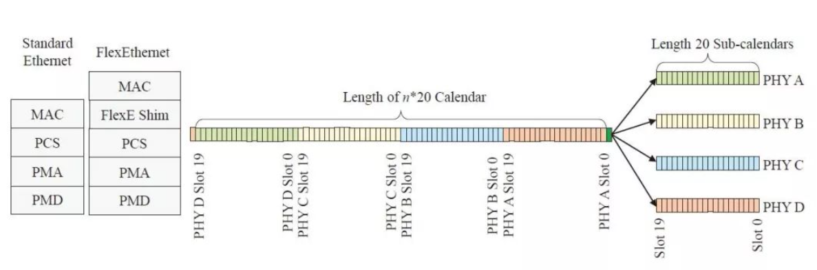 硬隔离方案基于灵活以太网(FlexE)技术。FlexE通过在以太网的物理编码子层(PCS)引入一个时分复用(TDM)的Flex垫层(Shim),实现了 MAC层和PHY层接口收发器的解耦,从而提升以太网组网灵活性。FlexE客户在 FlexE Shim层占用时隙采用灵活方式,通过 FlexE开销指明时隙被哪个业务占用。FlexE通过 Shim层的时隙配置支持多个客户业务,实现承载不同客户业务的网络切片之间的物理隔离。基于时隙调度的 FlexE分片将物理以太网端口划分为多个以太网弹性管道,使得承载网络既具备以太网统计复用、网络效率高的特点,又具备类似于 TDM独占时隙、隔离性好的特性。
