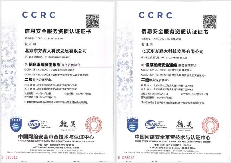 面向未来,东方森太将以此次双资质为新起点,持续加大安全技术研发投入,深化行业场景化服务能力,携手生态伙伴共建可信、可控、可持续的网络安全环境,为数字中国建设筑牢安全屏障,为客户业务保驾护航!