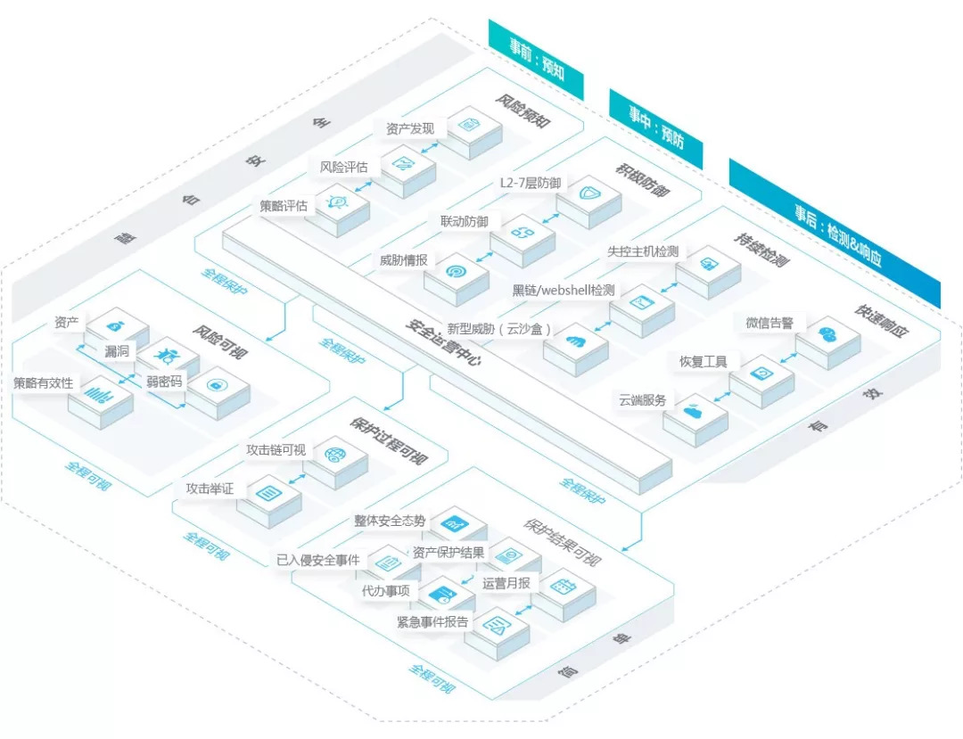 事后:持续检测绕过防御的威胁,并通过云端安全服务提供7*24小时快速响应的技术服务。在IT业务运维全过程内向用户提供对风险的认知、对保护过程的认知和对结果的认知,帮助您的IT系统更简单、更安全、更有价值。