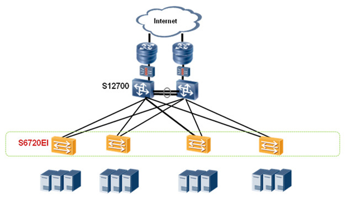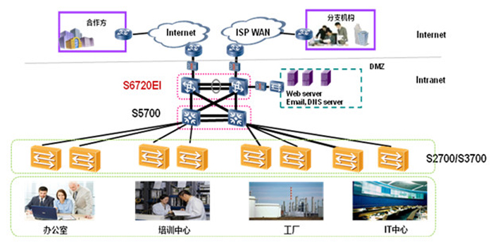 S6720-EI可用于中小型园区网的核心,其业界领先的高密度全线速万兆端口,顺应网络带宽需求日益膨胀的趋势;其丰富的业务特性、完善的安全控制机制使得S6720成为园区交换机高性价比的选择。